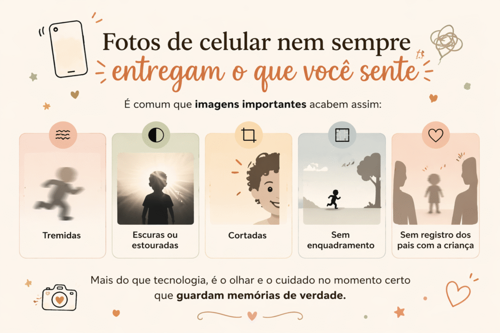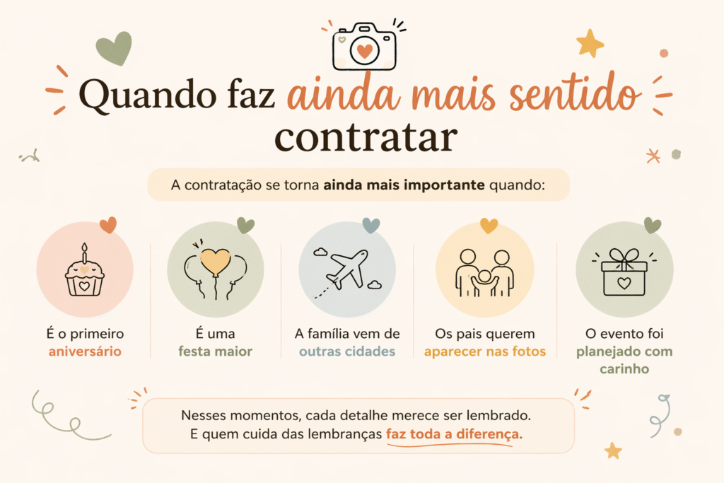 Se você está organizando uma festa e chegou nessa dúvida, saiba que ela é extremamente comum. Muitos pais pensam: “Será que vale mesmo investir em fotógrafo ou dá para resolver com celular?”